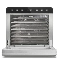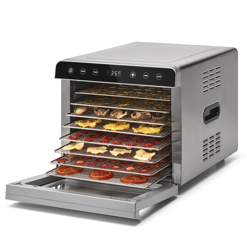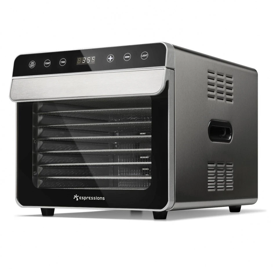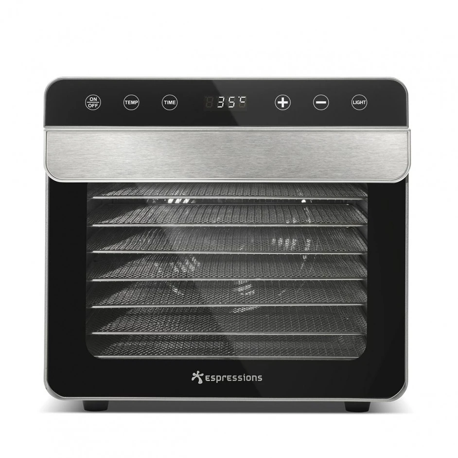 De Espressions Voedseldroger Smart komt met 8 ruime roestvrijstalen droogrekken. Het heeft een vermogen van 700 watt en is snel op de juiste temperatuur. Je kan het apparaat instellen tussen 35° en 85°Celsius en dan in stapjes 5 graden. De timer is in te stellen per 30 minuten met een looptijd van 30 minuten tot 24 uur.