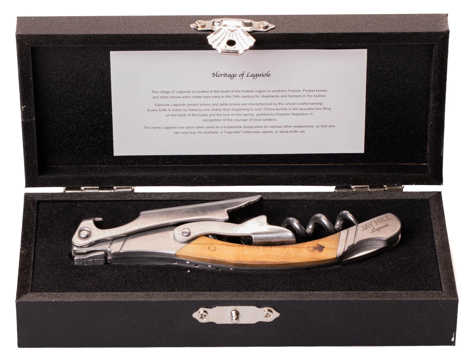 Zoek jij een kurkentrekker van kwaliteit met een mooi design? Deze multifunctionele Laguiole kurkentrekker van Jay Hill heeft een ergonomisch design met een stijlvolle look. Naast het scherpe lemmet is het zakmes ook voorzien van een kurkentrekker en handige flessenopener. Wil je deze kurkentrekker cadeau geven? De Jay Hill kurkentrekker wordt geleverd in een luxe houten kist met mooie geschenkverpakking.