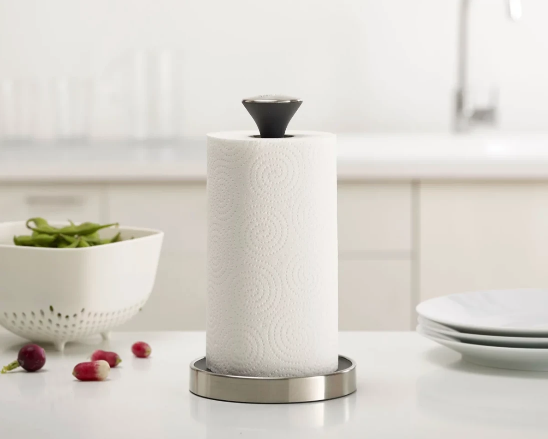 Deze handige keukenrolhouder heeft een dop die door middel van een veer naar beneden kan worden geschoven om de rol vast te zetten, zodat de keukenrol gemakkelijk kan worden afgescheurd. De antisliplaag houdt de keukenrol tijdens gebruik stevig op zijn plaats. Deze keukenrolhouder is ook erg hygiënisch en kan met de pols of onderarm worden bediend als je handen vies zijn. Om de rol te vervangen, draait u gewoon de bovenste dop eraf. De keukenrolhouder is geschikt voor keukenrollen met een hoogte tot 24 cm.