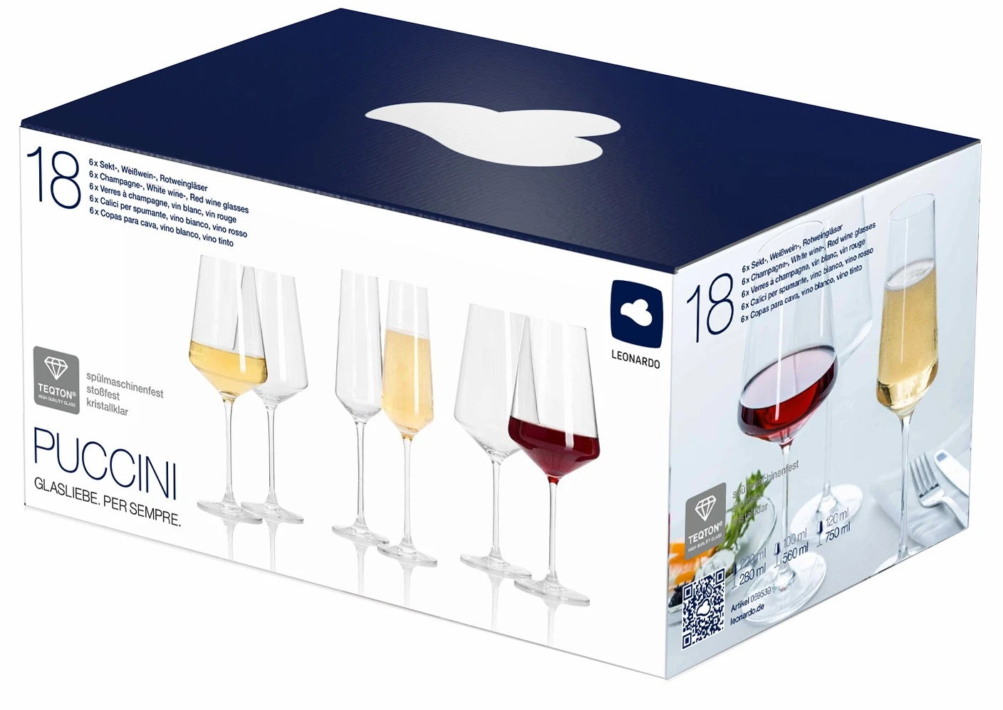 Ben jij op zoek naar een glazenset, gevuld met witte wijnglazen, rode wijnglazen en champagneglazen? Dan is de Leonardo Glazenset Puccini perfect voor jou. Allemaal gemaakt van TeQton glas waardoor ze vaatwasserbestendig zijn en krasbestendig. De blijvende helderheid houdt deze glazen mooi voor altijd! De Leonardo Glazenset Puccini bestaat uit: