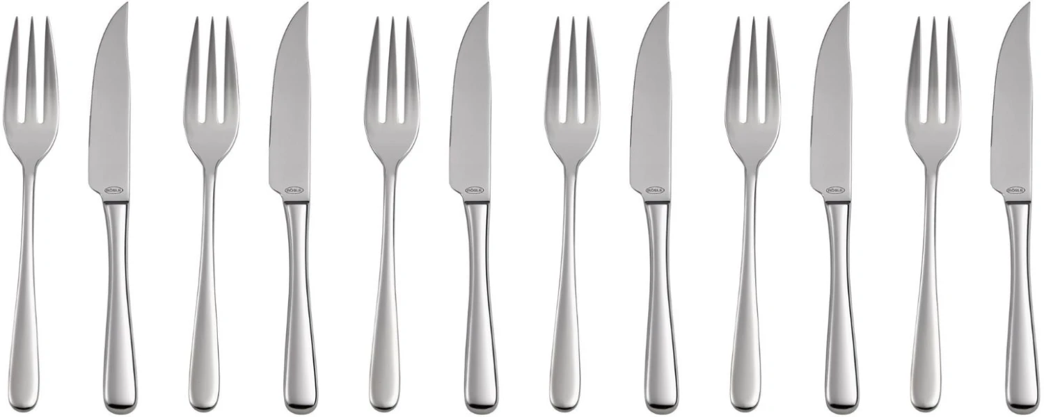 De 12-delige set bestaat uit 6 steakvorken en 6 scherpe steakmessen met de volgende afmetingen: