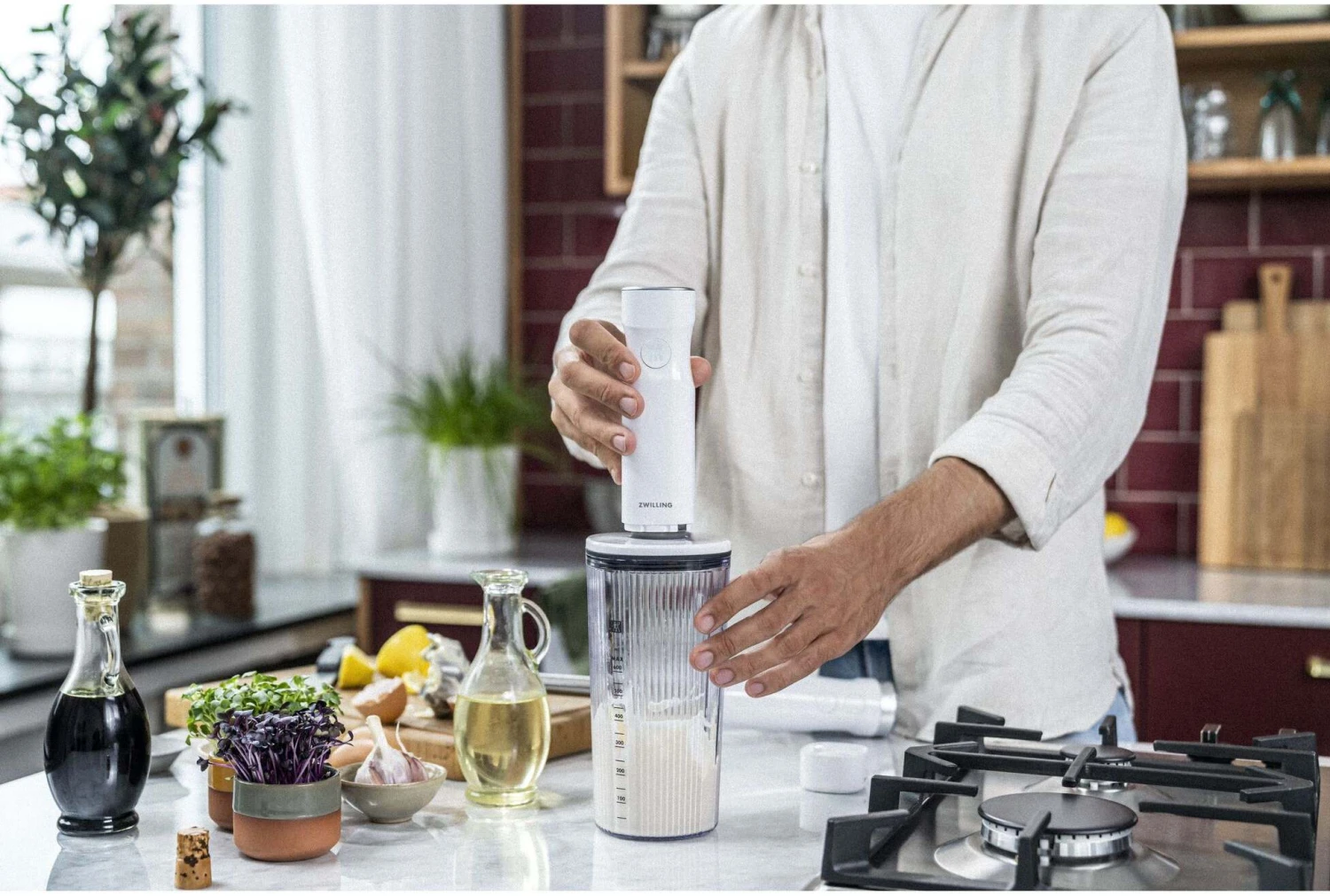 De 600 ml maatbeker is gemaakt van BPA-vrij plastic en heeft een deksel dat compatibel is met ZWILLING FRESH & SAVE. Hierdoor kun je bijvoorbeeld sauzen voorbereiden in de ochtend, ze vacuüm trekken en er ’s avonds vers van genieten. De staafmixer heeft ook een soft-startfunctie die spatten vermindert, een intuïtieve 2-knopsbediening en wordt geleverd met een kabel van 1,2 meter voor extra gebruiksgemak in de keuken.